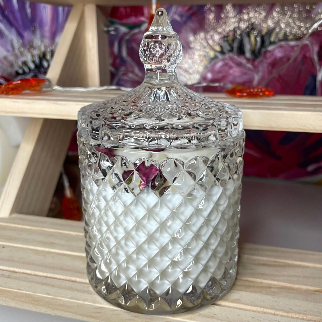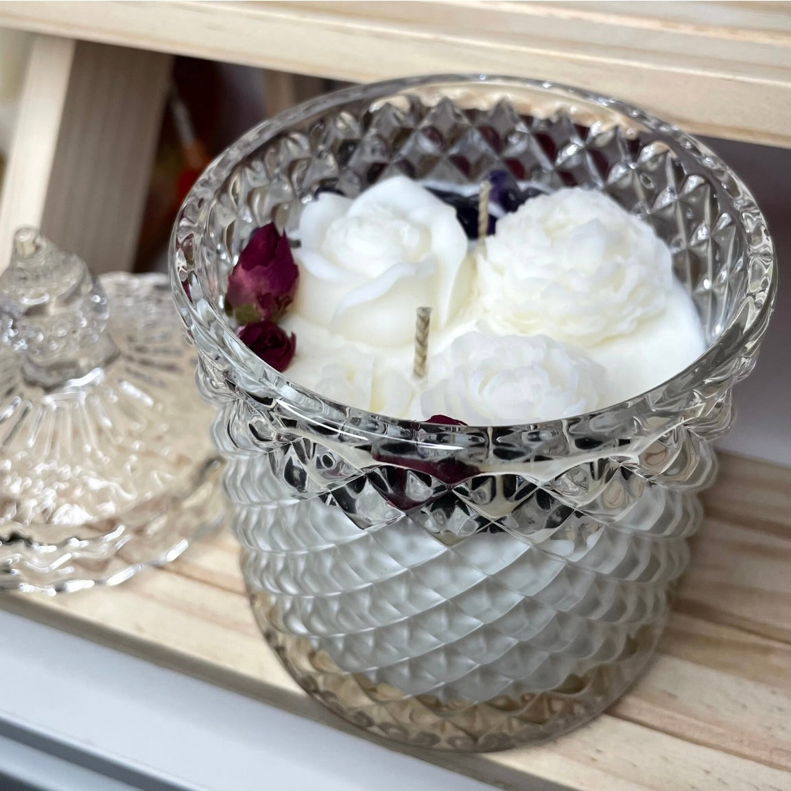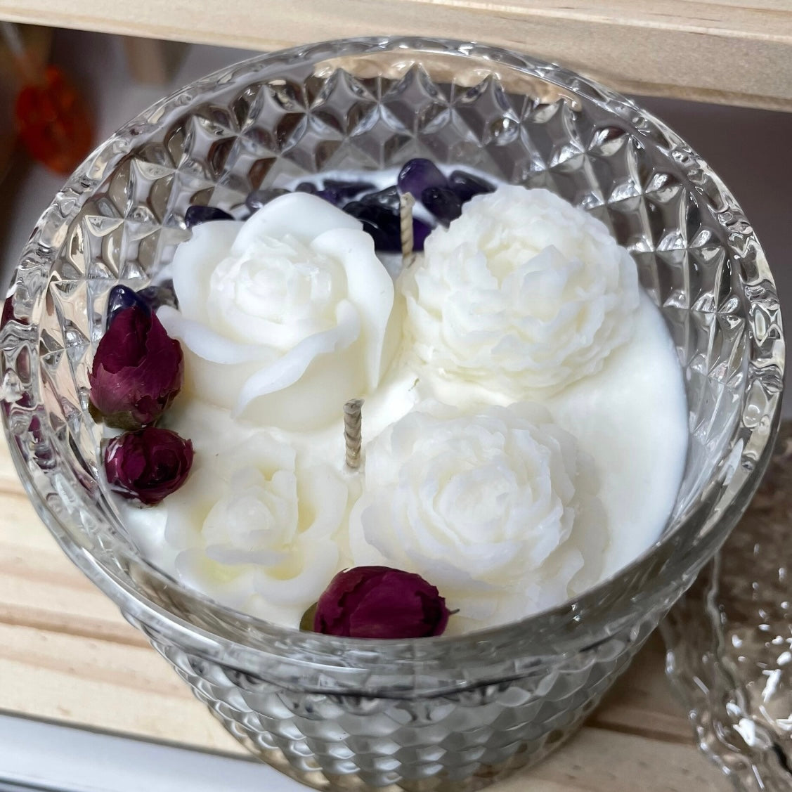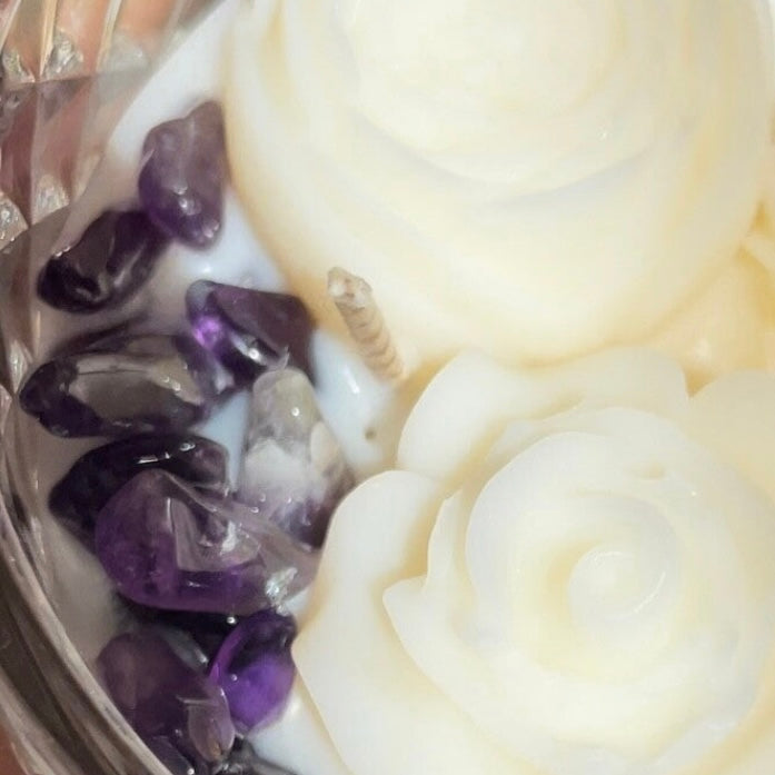 Diese wunderschöne Duftkerze im Glas ist aus Sojawachs und Kokoswachs hergestellt und ist mit Trockenrosen und Edelsteinen (Amethyst) verziert.