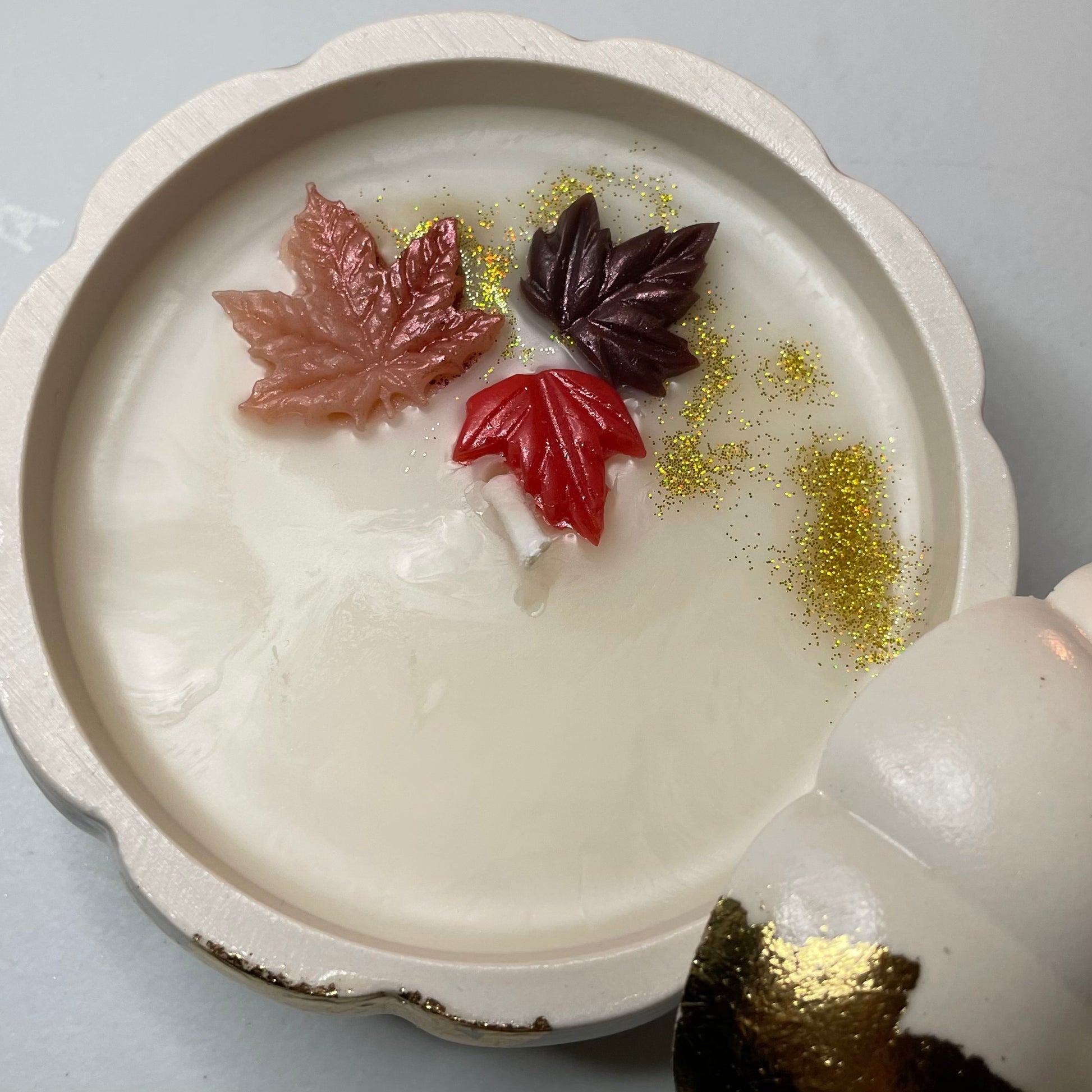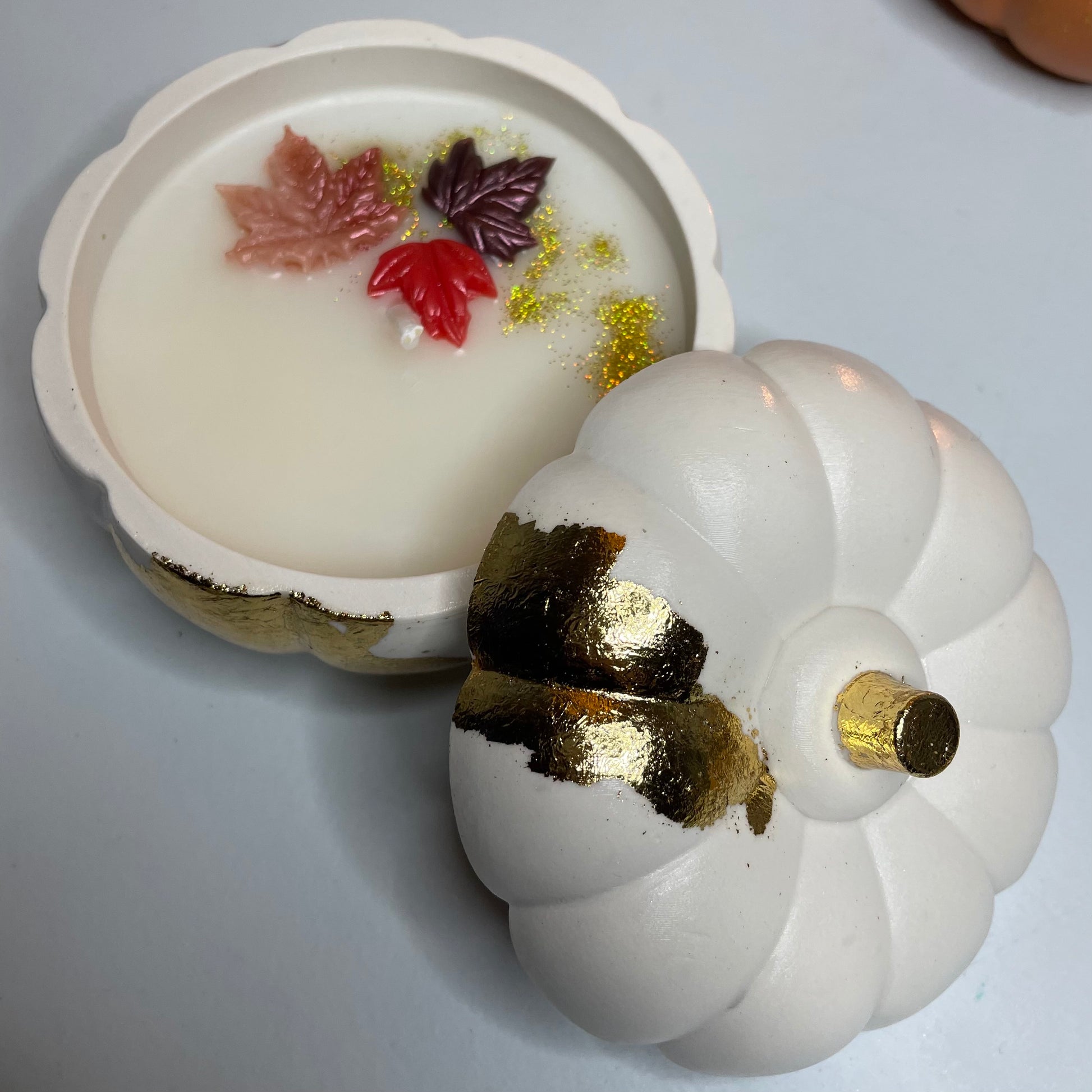 Die Kerze ist handgefertigt aus Jesmonite und Kokoswachs. Jesmonite ist ein auf Wasser basierendes, lösungsmittelfreies und umweltfreundliches Acrylharz. Wir verwenden 100% pflanzliches Kokoswachs, das aus nachwachsenden Rohstoffen in der EU hergestellt wird. Es ist vegan und tierversuchsfrei. Der Kürbis ist mit Blattgold verziert.