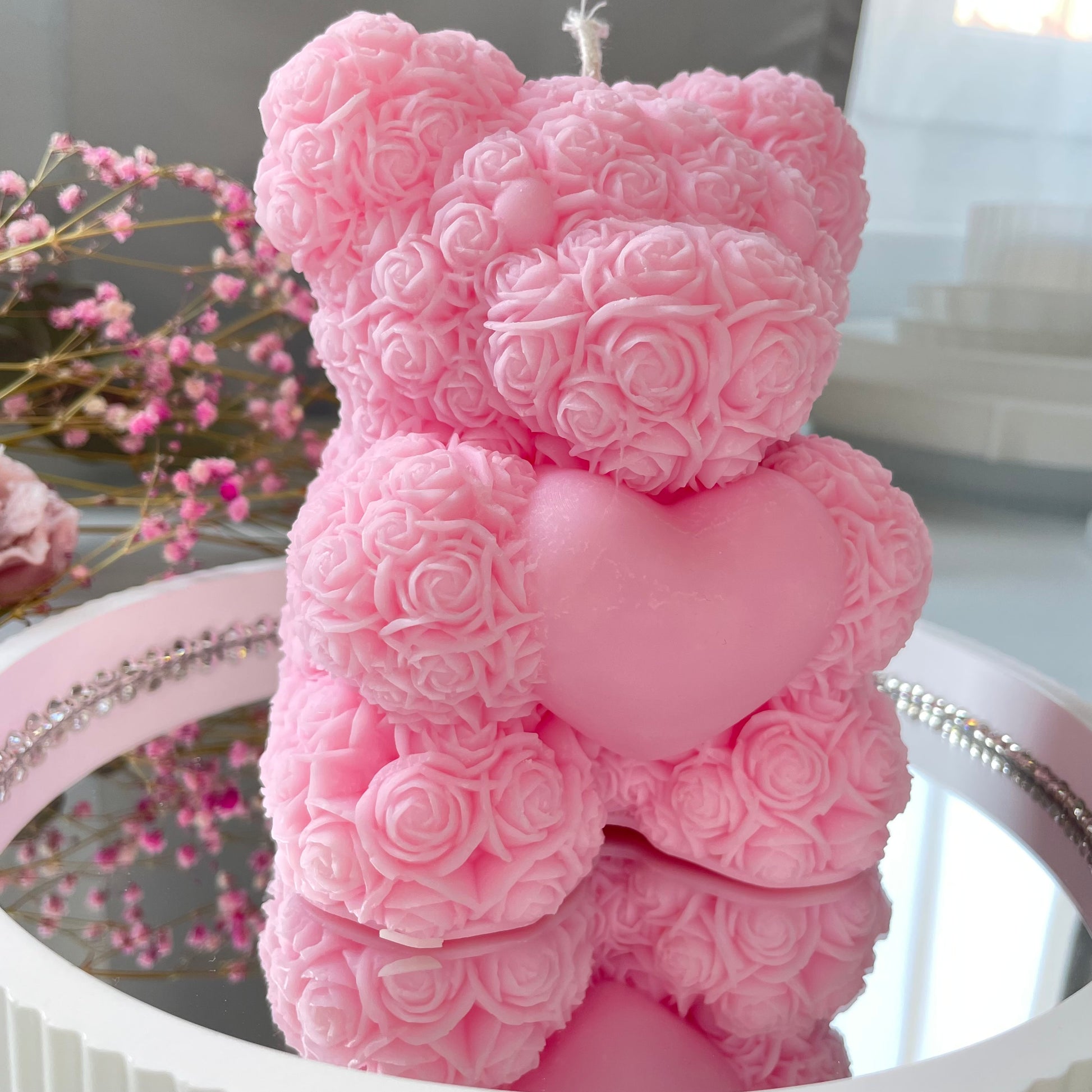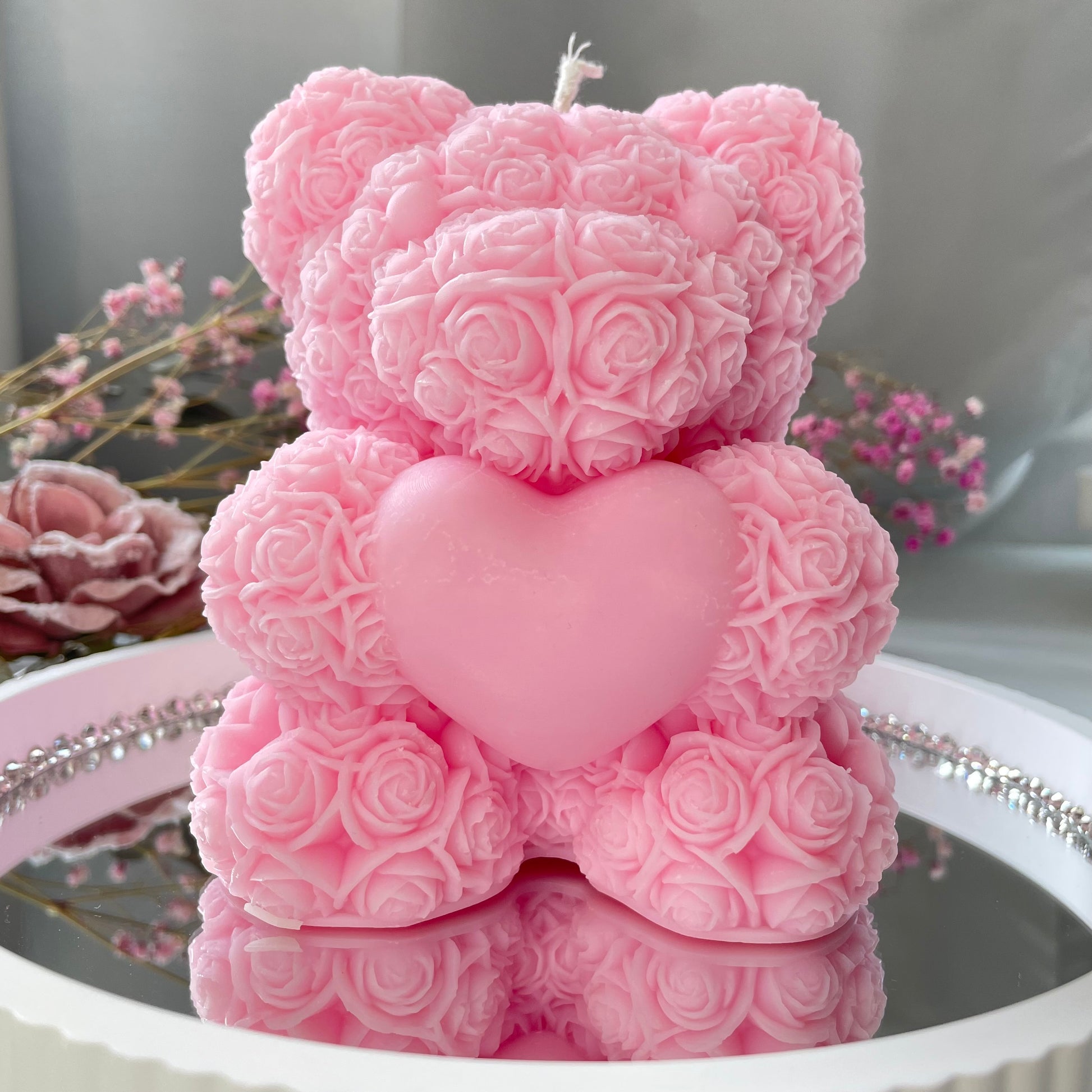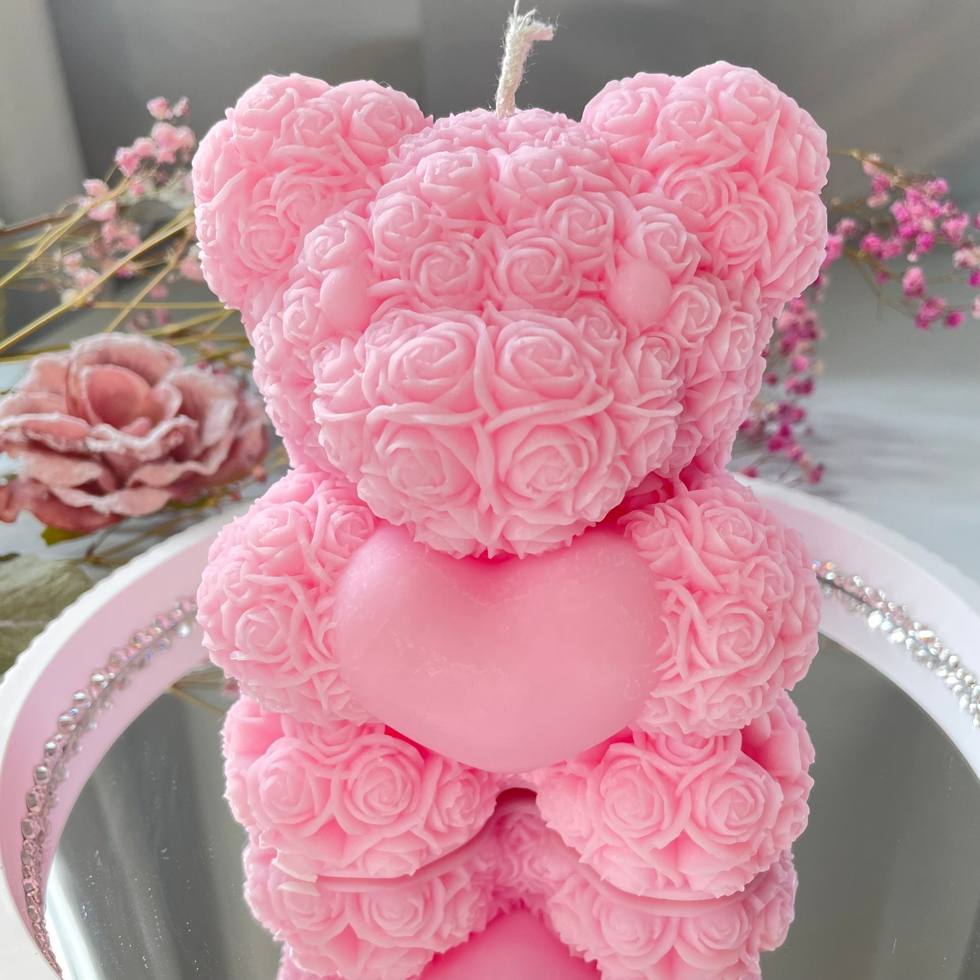 Die Kerze ist handgefertigt aus Kokoswachs. Die Rosenbärkerze wird in einer durchsichtigen Box mit einer roten Schleife geliefert.