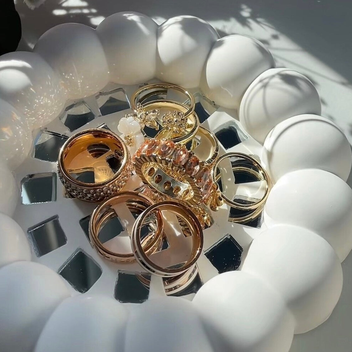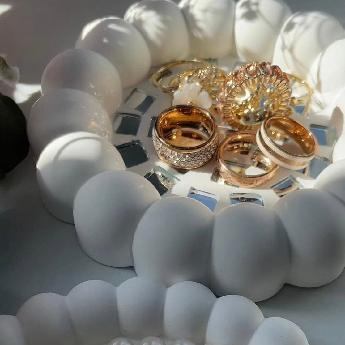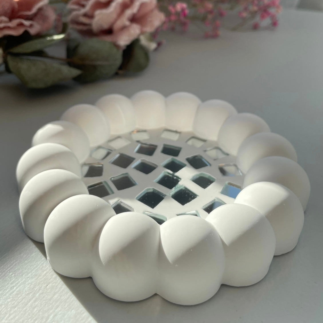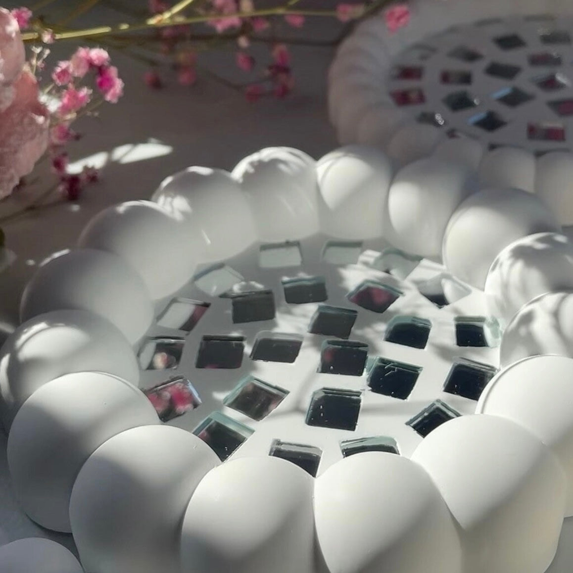 Das runde Spiegel-Mosaik-Tablett ist handgefertigt aus Keramik-Gießpulver und Spiegelmosaik. Sehr gut als Untersetzer für Kerzen, Schmuck und Co. geeignet. Große Bubble.