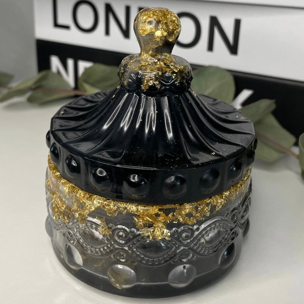 Die Schatulle ist handgefertigt aus Resin. Im Produkt sind Glitzer und Blattgold eingearbeitet. Passend dazu findest du einen Seifenspender und einen Tablett im Shop.