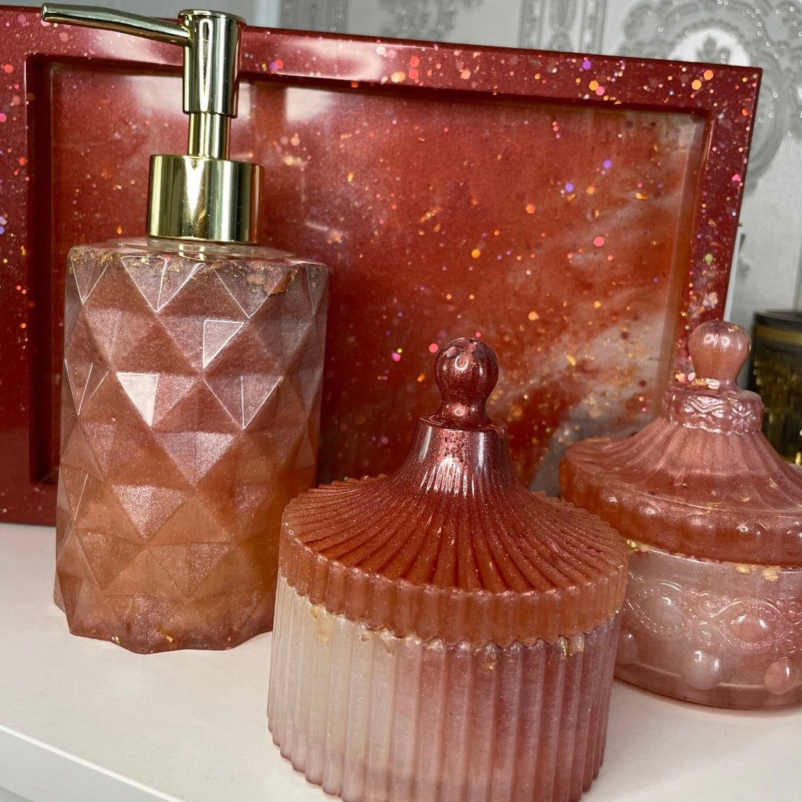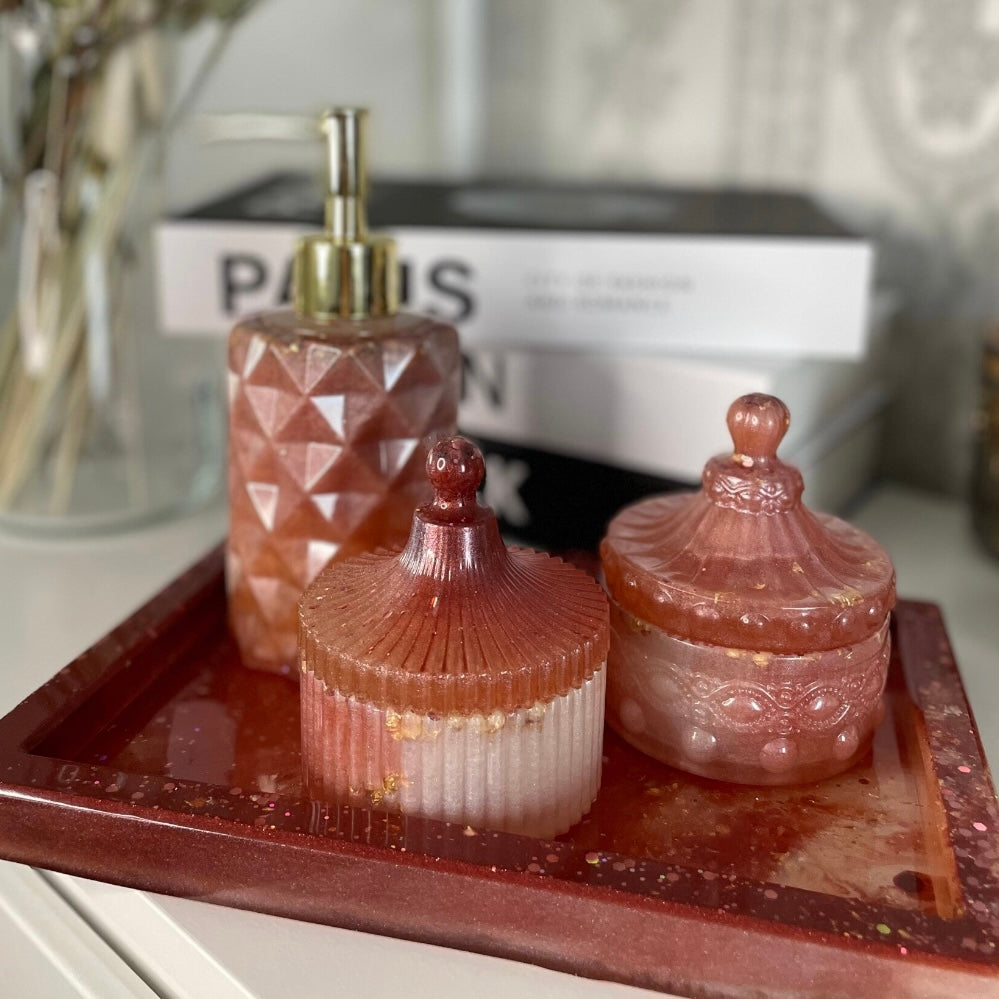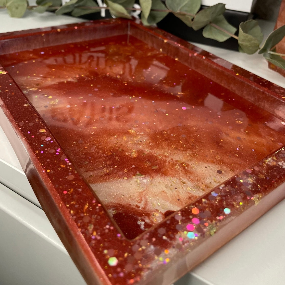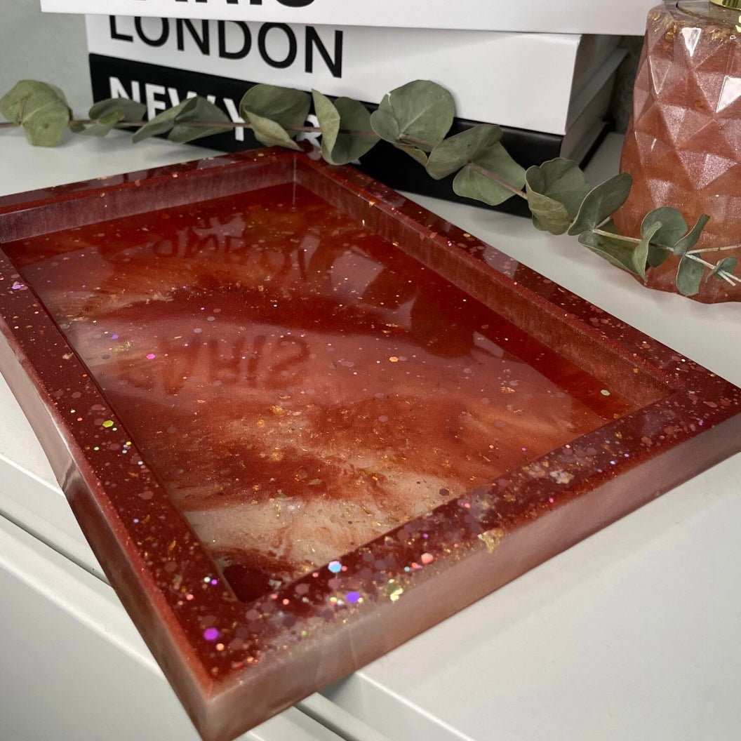 Das Tablett ist handgefertigt aus Resin. Im Produkt sind Glitzer und Blattgold eingearbeitet. Passend dazu findest du einen Seifenspender und Dosen im Shop.
