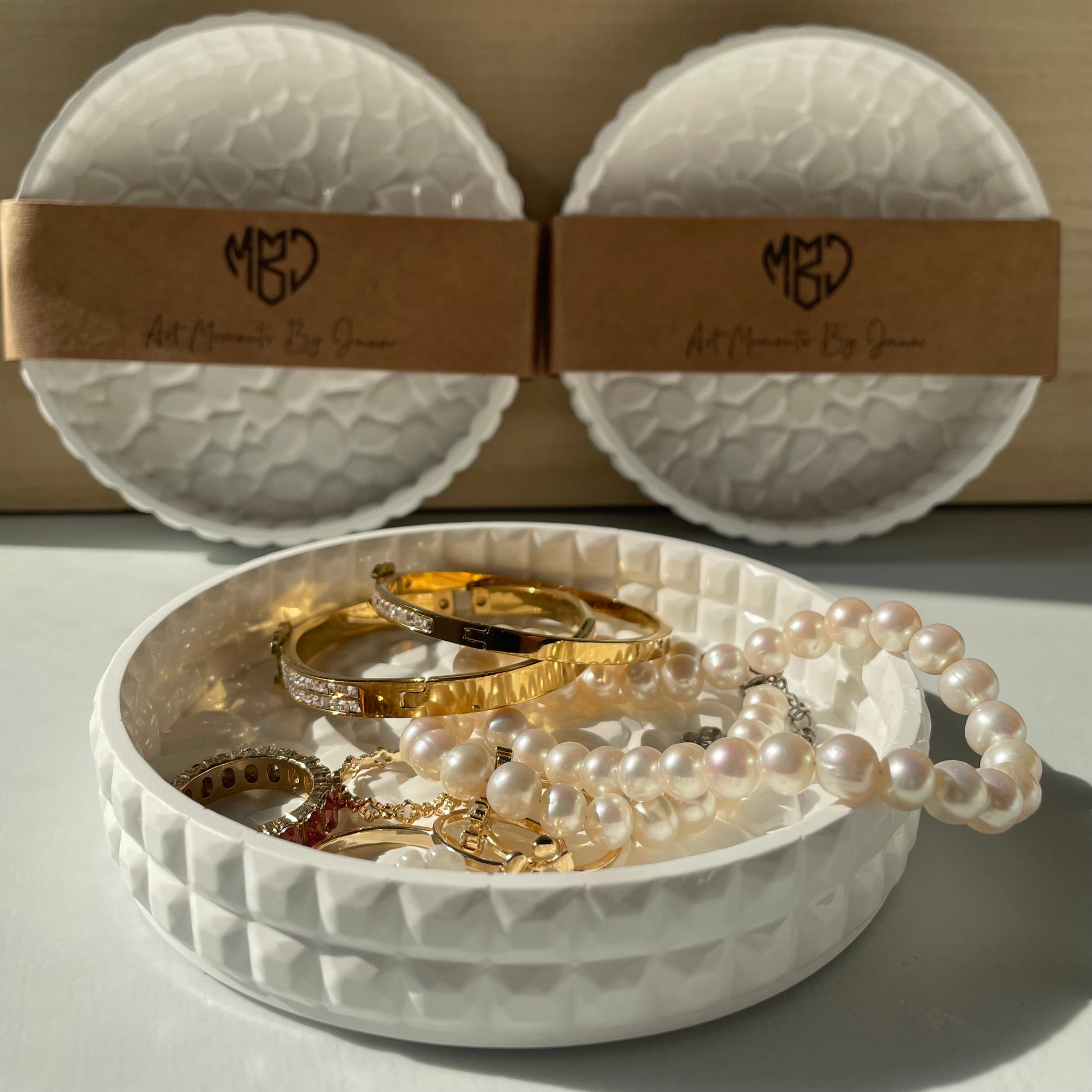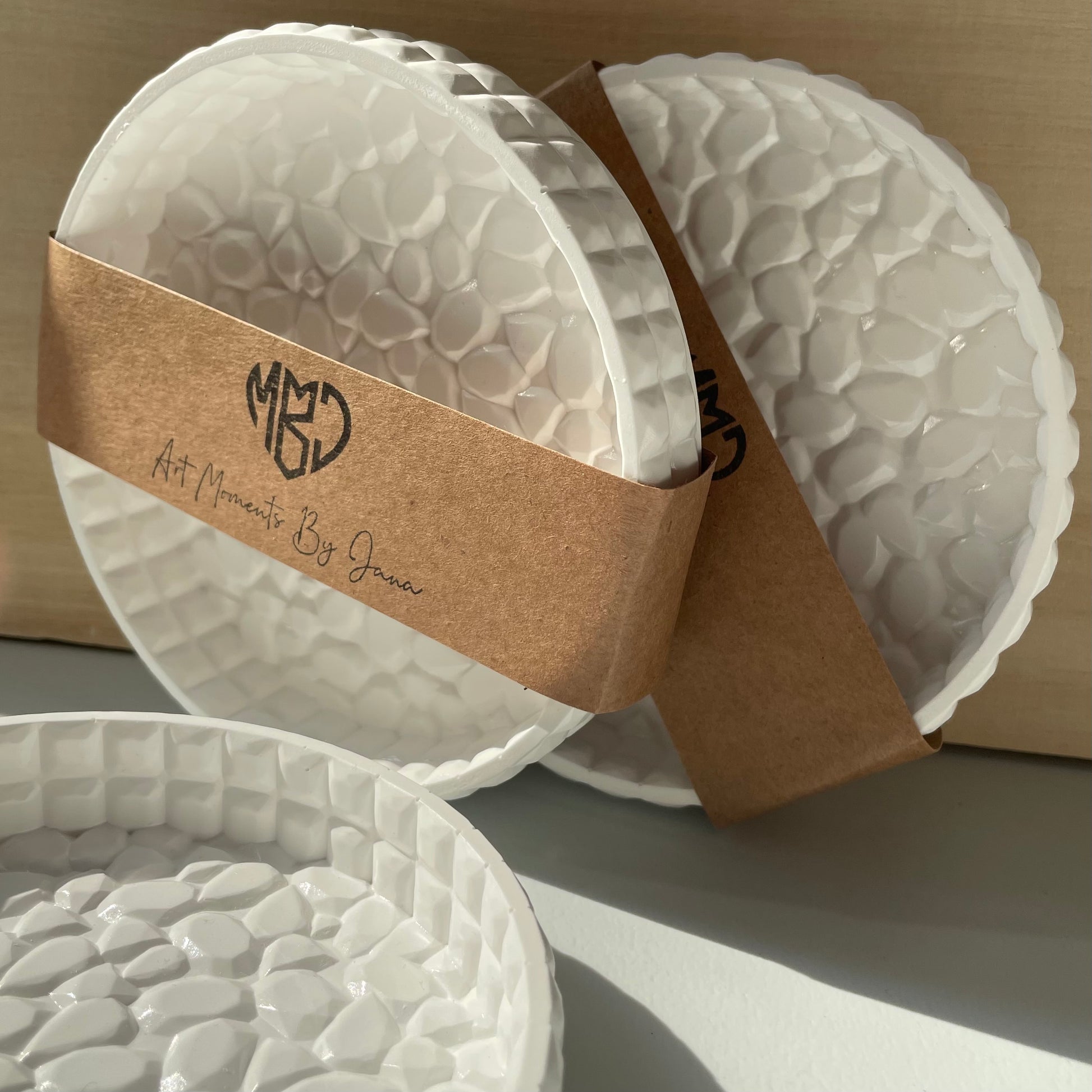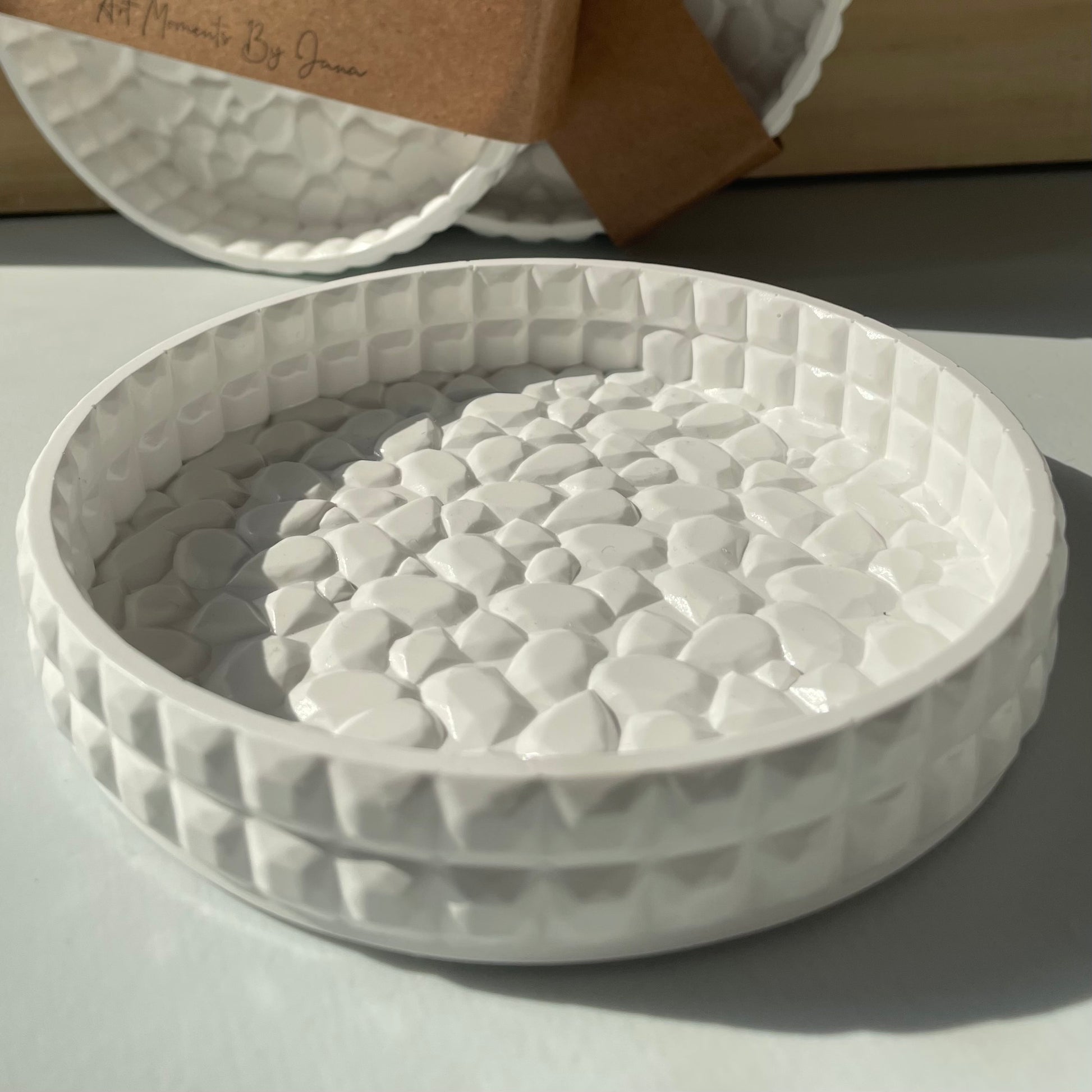 Das runde Tablett ist handgefertigt aus Keramik-Gießpulver. Sehr gut als Untersetzer für Kerzen, Schmuck und Co. geeignet.